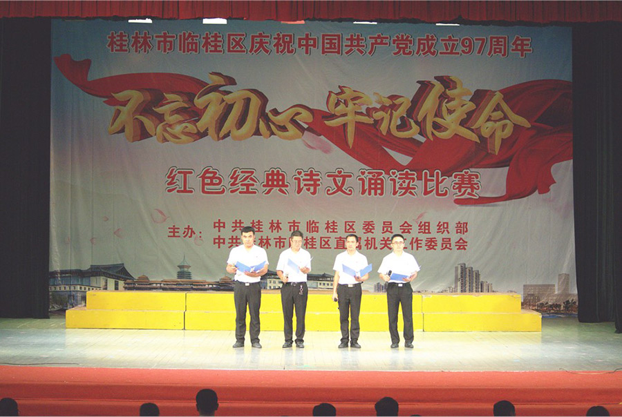 7月19日上午,陽(yáng)光明媚。新城投資集團(tuán)黨支部朱憲民、譚佳璐、周成、唐忠祥四名黨員在黨支部青年委員趙建斌的帶領(lǐng)下,前往臨桂影劇院參加臨桂區(qū)委組織部、臨桂區(qū)直機(jī)關(guān)工委舉辦的“不忘初心·牢記使命”紅色經(jīng)典詩(shī)文誦讀比賽活動(dòng)。