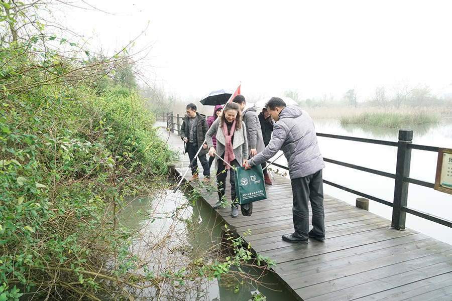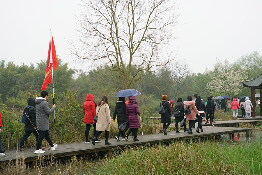 桂林會仙濕地管理局為“會仙濕地洗臉”環(huán)保徒步活動提供了向?qū)Р才艑H酥v解了規(guī)劃。婦女同志在濕地宣教館觀看宣傳片后,分別領取鐵鉗、垃圾袋,沿著濕地棧道方向,邊走邊用鐵鉗拾撿著路邊的食品袋、塑料袋、飲料瓶等污染垃圾,不一會兒功夫,大伙兒拎著的垃圾袋已快填充裝滿。過往的群眾為婦女同志不怕臟不怕累的志愿行動所感動,紛紛豎起大拇指點贊,部分群眾還自發(fā)的加入為濕地洗臉公益環(huán)?;顒印?nbsp;
