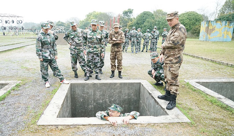 “敬禮、立正、稍息、跨立、停止間轉(zhuǎn)法!”嘹亮的軍事訓(xùn)練口號在操場上響起。天空飄著細(xì)雨,但沒有一人叫苦叫累,大家仔細(xì)聽教官對每個動作的分解講解,認(rèn)真領(lǐng)會并糾正動作,每一個動作都力爭規(guī)范標(biāo)準(zhǔn)。400米障礙軍事技能場上,教官展示完后,大家都不甘示弱,分組嘗試完成跨樁、深坑、矮墻、高板跳臺、云梯、獨(dú)木橋、高墻、低樁網(wǎng)單等項(xiàng)目。中午訓(xùn)練結(jié)束后,大家在教官的帶領(lǐng)下進(jìn)行了飯前一首歌的拉歌準(zhǔn)備。大家嚴(yán)格按用餐紀(jì)律,等候不說話、打飯按順序、餐后自己洗碗。飯后,大家用半小時參觀了基地內(nèi)務(wù),然后又進(jìn)入緊張的訓(xùn)練中。
