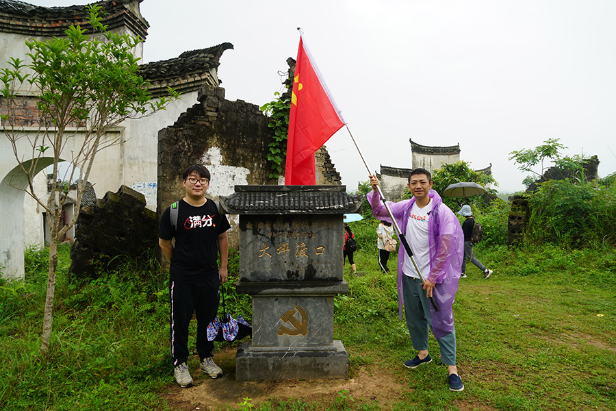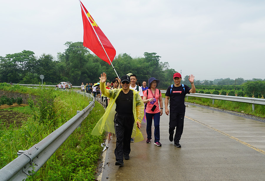 上午11點(diǎn),同志們乘車到達(dá)全州縣紹水鎮(zhèn)下宅村,整裝齊隊(duì),高舉黨旗,踏上了尋訪當(dāng)年紅軍長征足跡,緬懷革命先烈的紅色之旅。行進(jìn)中,天空下著瓢潑大雨,同志們一邊行軍,一邊唱紅歌,一邊品讀著紅軍長征的艱辛。