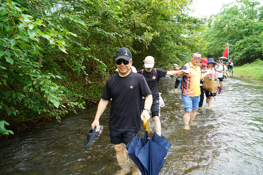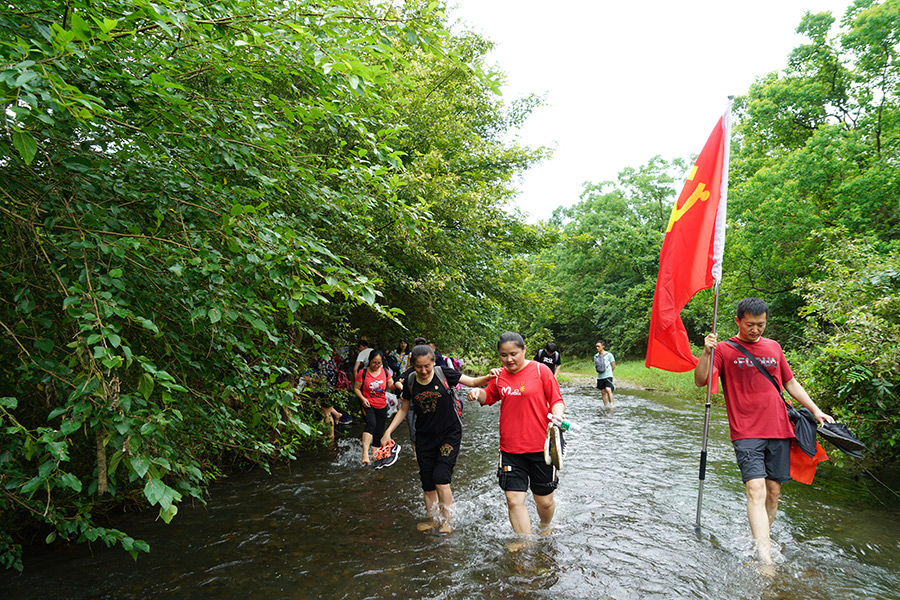 大雨過后,烈日當(dāng)空,地表溫度迅速上升,空氣中的水蒸氣增多,汗液難于蒸發(fā),面對(duì)濕熱天氣,大家義無反顧的前進(jìn),衣服濕了又干,干了又濕。中午14點(diǎn),隊(duì)伍進(jìn)入一片樹林,起初地勢較為平坦、道路開闊……漸漸地,地面開始凹凸不平,有了越來越多的水坑,道路開始變窄,一條小溪攔住了隊(duì)伍。大家紛紛脫鞋下水,手拉著手、攙扶著后面的同志在溪水中行進(jìn),本著不能讓任何一個(gè)同志掉隊(duì)的信念,整個(gè)團(tuán)隊(duì)相互鼓勁、相互扶持,克服困難,攜手踏過這段溪流。