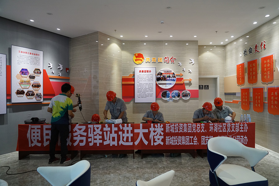 在中華人民共和國成立70周年即將來臨之際,9月30日上午,新城投資集團黨總支聯(lián)合環(huán)湖社區(qū)黨支部、宏謀物業(yè)公司在新城投資集團辦公大樓一樓舉辦“‘不忘初心、牢記使命’便民服務(wù)驛站進大樓志愿服務(wù)活動”,為在本大樓辦公的總工會、水利局、司法局員工提供小家電維修服務(wù),黨員以實際行動踐行為身邊群眾辦實事、辦好事?;顒釉谛鲁峭顿Y集團黨總支、環(huán)湖社區(qū)黨支部全體黨員合唱的《我和我的祖國》歌聲中啟動,大家用嘹亮的歌聲、真摯的情感抒發(fā)出對偉大祖國的最美好的祝愿!集團黨總支籌備工作領(lǐng)導(dǎo)小組組長、董事長周道林,黨總支籌備工作領(lǐng)導(dǎo)小組副組長、副總經(jīng)理鄧仁友,環(huán)湖社區(qū)第一書記蔡燕,環(huán)湖社區(qū)黨支部書記、居委會主任李伊倩出席了活動。