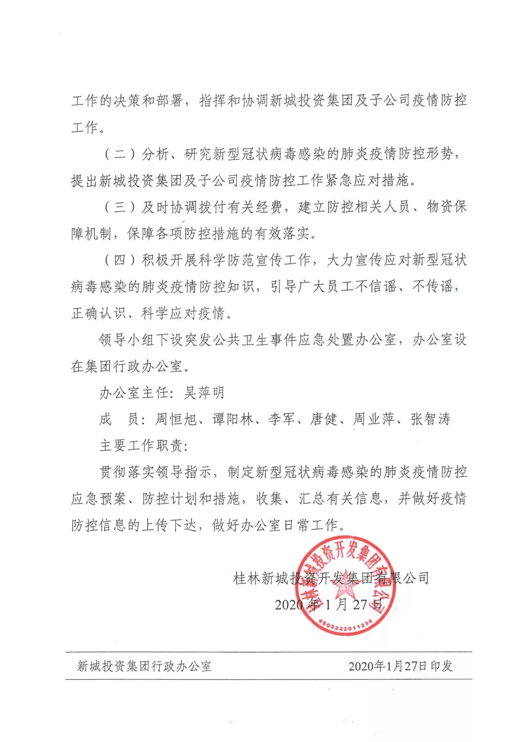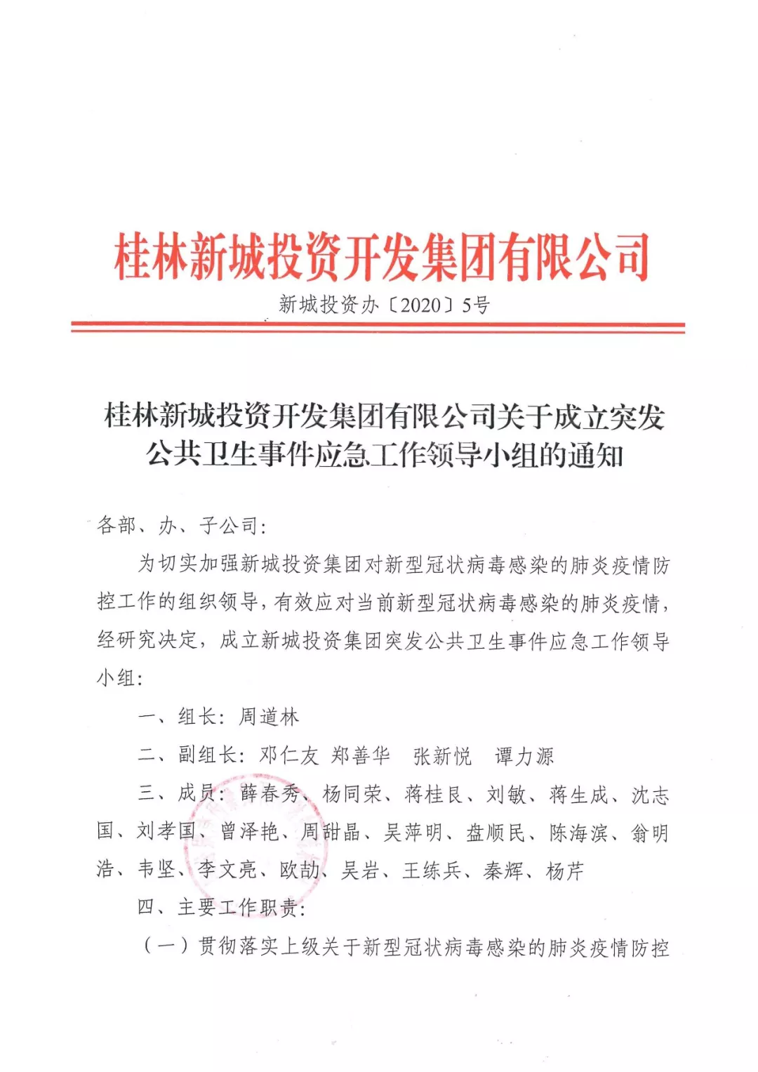 在新春佳節(jié)、闔家團聚之際,新型冠狀病毒感染肺炎疫情防控形勢十分嚴峻。黨中央對疫情防控工作高度重視,習近平總書記作出重要指示。自治區(qū)黨委、政府和市委、市政府正在密集部署疫情防控工作,為響應切實打贏疫情防控狙擊戰(zhàn)的戰(zhàn)斗號召,新城投資集團黨支部書記、董事長、總經(jīng)理周道林要求集團公司迅速進入“戰(zhàn)時狀態(tài)”,堅決貫徹落實習近平總書記重要指示和講話精神,把抗擊疫情作為檢驗“不忘初心、牢記使命”主題教育成效的又一“試金石”,切實履行主體責任和工作職責,及時掌握疫情,及時采取行動,做到守土有責、守土盡責,堅決遏制疫情蔓延勢頭。