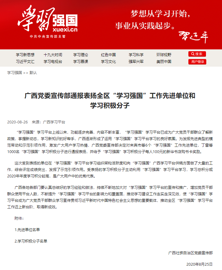 附:《廣西黨委宣傳部通報(bào)表揚(yáng)全區(qū)“學(xué)習(xí)強(qiáng)國”工作先進(jìn)單位和學(xué)習(xí)積極分子》