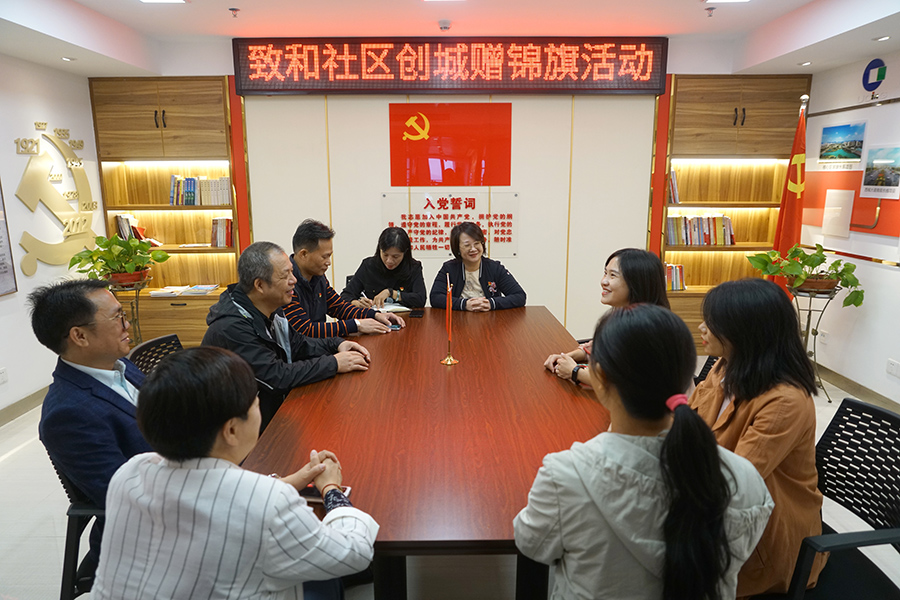 10月14日上午,臨桂區(qū)致和社區(qū)書(shū)記張妮妮一行三人將一面印有“黨旗映勝地 創(chuàng)城我先行”的錦旗交至新城投資集團(tuán)黨總支書(shū)記、董事長(zhǎng)、總經(jīng)理周道林手中,感謝新城投資集團(tuán)急群眾所急,想群眾所想,舉全力為社區(qū)、為群眾解難題、辦難事。