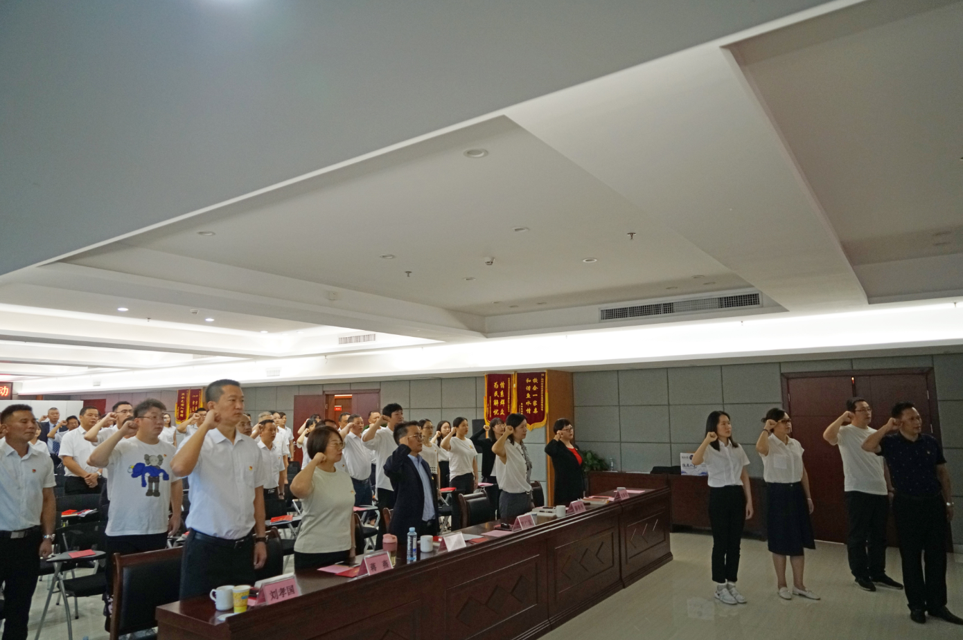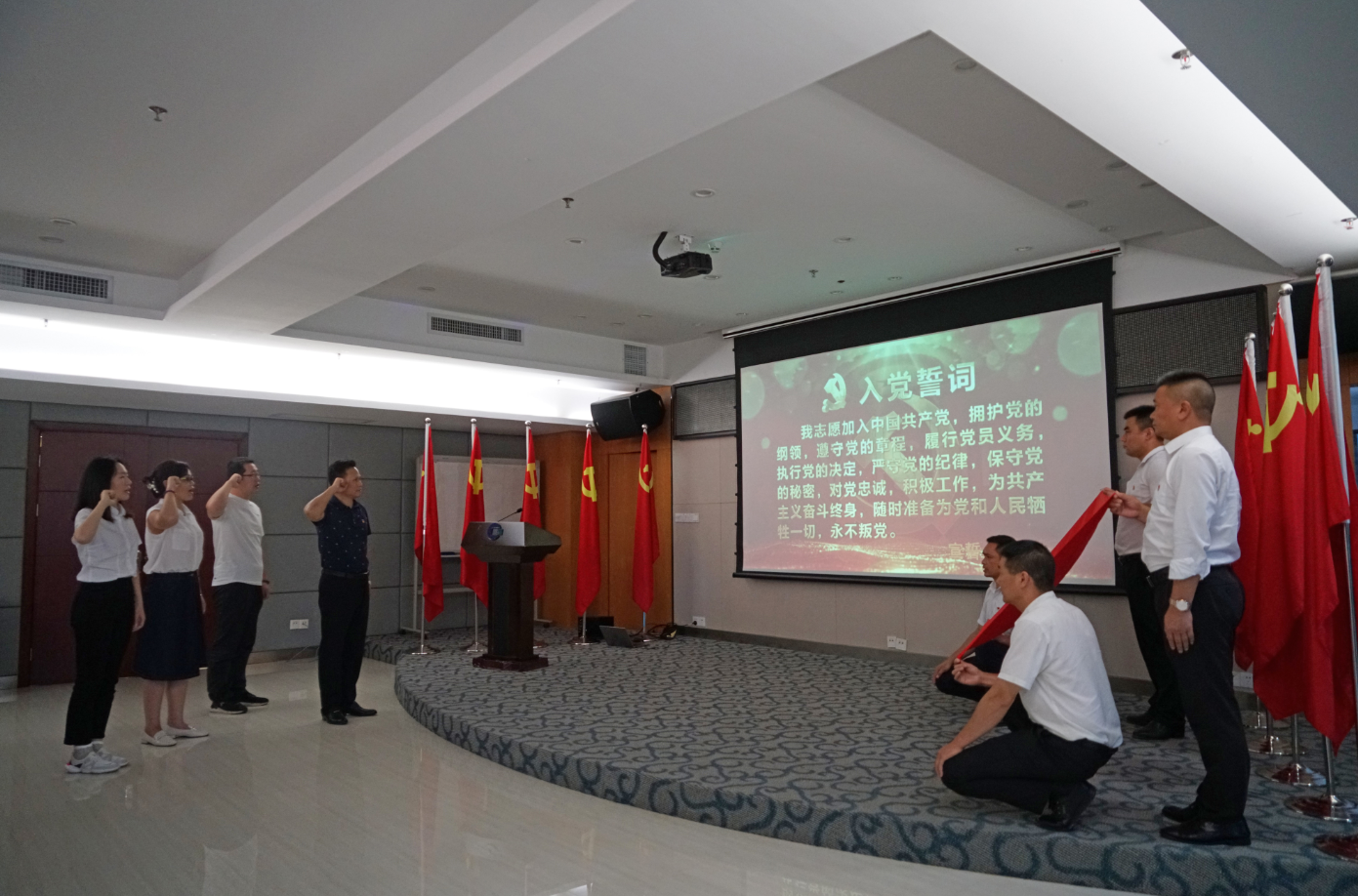為引導(dǎo)黨員繼承發(fā)揚老一輩革命家光榮傳統(tǒng),激發(fā)新黨員激情斗志,會場組織新發(fā)展的3名黨員周恒旭、劉萍、梁慧穎舉行了入黨宣誓,同時,全體黨員重溫入黨誓詞。