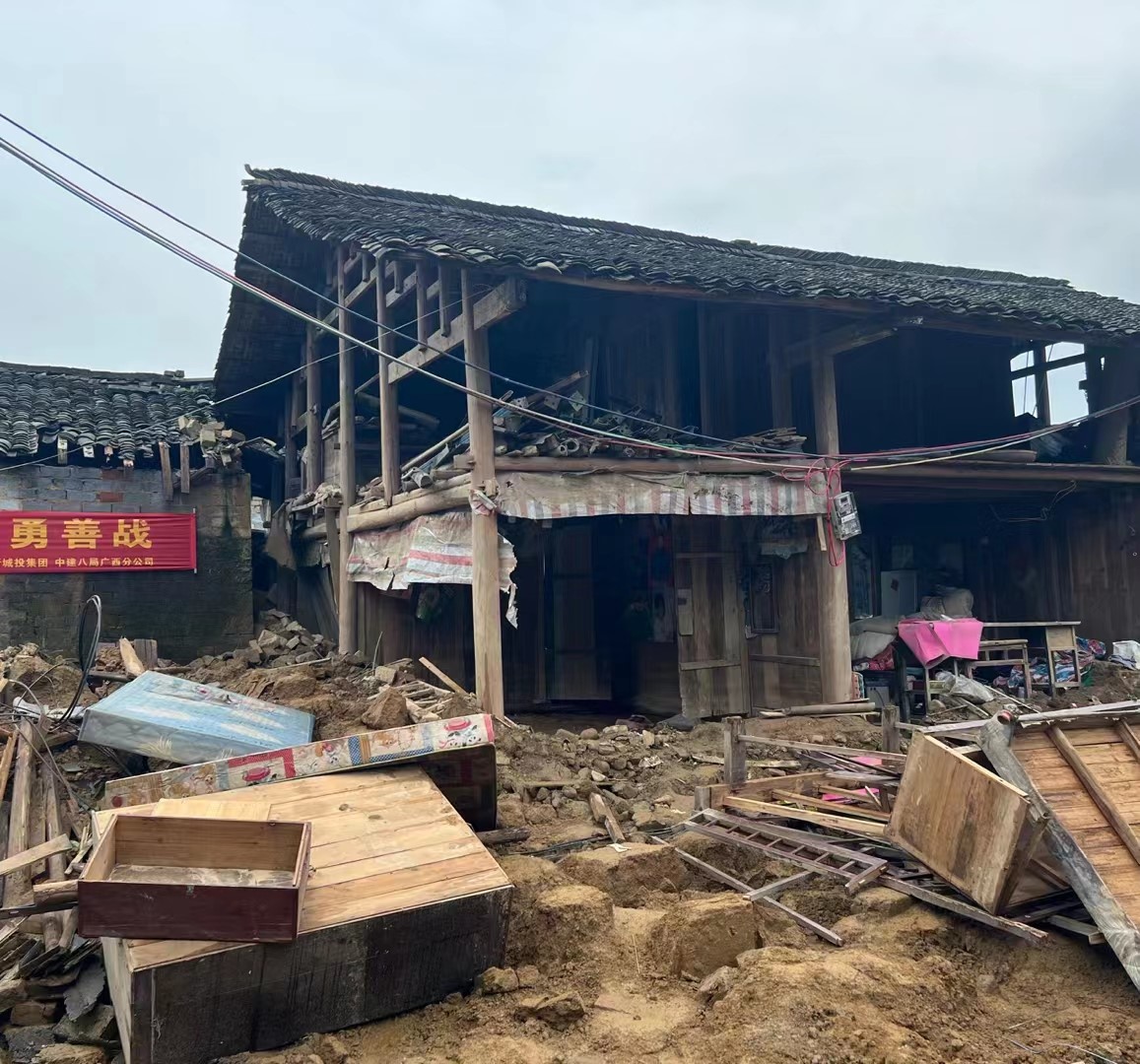 2022年6月28日上午8時(shí),昔日寧?kù)o的臨桂五通鎮(zhèn)羅江村大洲村機(jī)械轟鳴,一間民房墻頭上懸掛了落款單位為新區(qū)管委會(huì)、新城投集團(tuán)黨總支、中建八局廣西公司,寫(xiě)有“洪水無(wú)情人有情 一方有難八方支援”的橫幅。一臺(tái)挖土機(jī)正在有序的清理因房屋倒塌造成的巷道淤泥,拖拉機(jī)在一旁等著上土外運(yùn),一群年青人正聚集在一起揮鍬鏟土。筆者找到了在現(xiàn)場(chǎng)的羅江村委干部,了解相關(guān)情況。據(jù)這位村干部講,近期的洪水來(lái)勢(shì)兇猛,村里倒塌的土胚房阻占了進(jìn)出的巷道,村民進(jìn)出和自救成了大問(wèn)題,村委一籌莫展,這時(shí)他們想到了后盾單位。一位在場(chǎng)的八十多歲的老爺爺自言自語(yǔ)講,沒(méi)有他們帶領(lǐng)黨員突擊隊(duì)和清理機(jī)械到場(chǎng),那些村里被洪水沖毀房屋、損毀堵塞的道路都不知什么時(shí)候才能清理完,在他臉上,籠罩多日的愁云已經(jīng)消散……