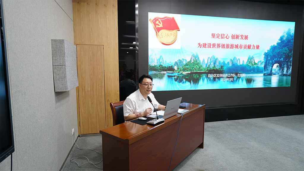 在活動中,左旭陽還給大家上了一堂有思想、有深度、有意義的黨課。黨課以《堅定信心 創(chuàng)新發(fā)展 為建設(shè)世界級旅游城市貢獻力量》為題,從多個方面進行了深入的講解和闡述。他重點解讀了《中國共產(chǎn)黨紀(jì)律處分條例》,強調(diào)了黨風(fēng)黨紀(jì)建設(shè)的重要性和必要性;講解了《關(guān)于支持廣西加快打造國內(nèi)國際雙循環(huán)市場經(jīng)營便利地的若干措施》,探尋了發(fā)展的契機;分享了工作中的創(chuàng)新及成果感悟,提升了黨員干部干事創(chuàng)業(yè)的“精氣神”;把脈新城投集團的發(fā)展方向,增強了大家大有可為、時不我待的信心。