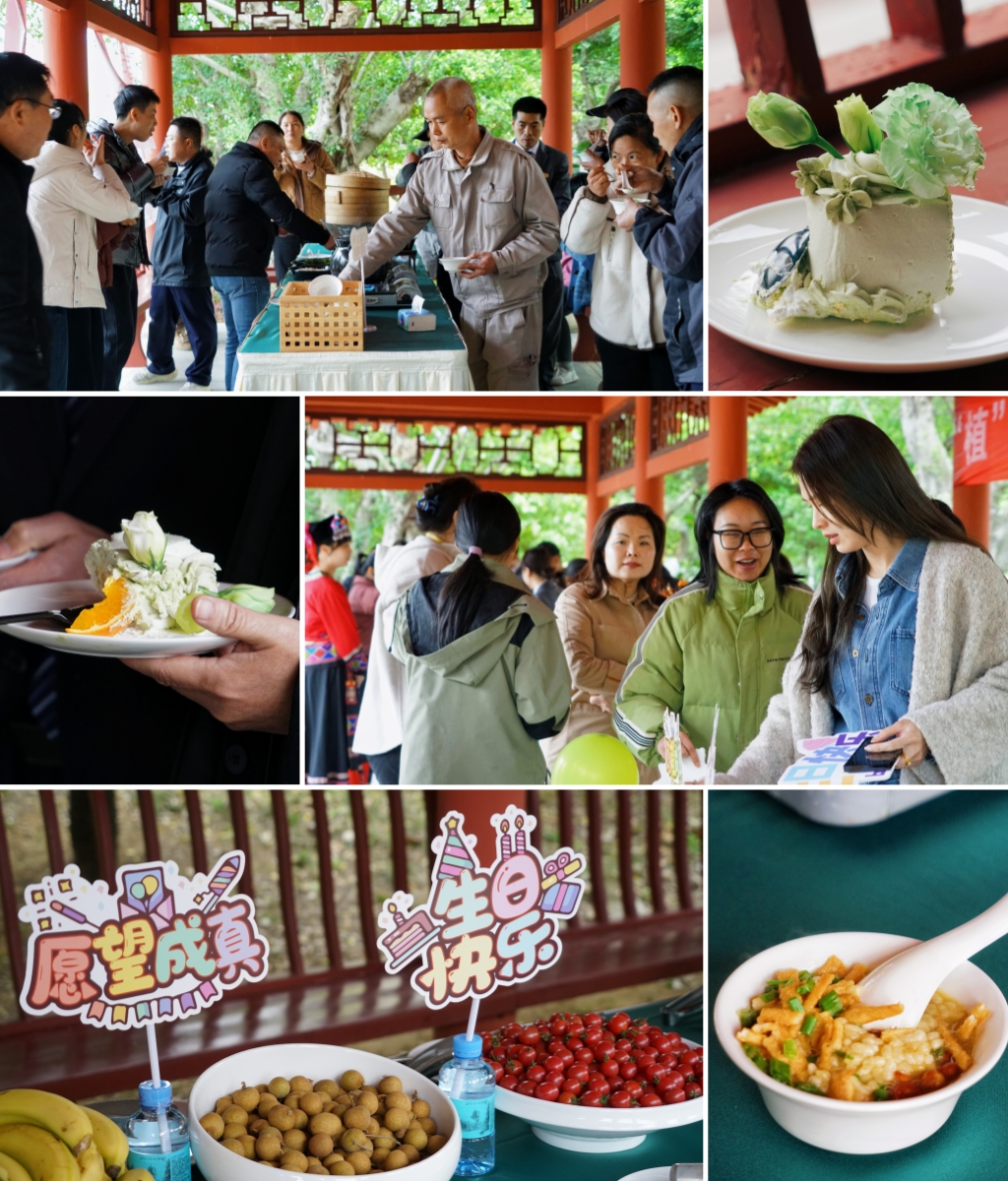 在茶歇環(huán)節(jié)中,弘毅亭長廊早已擺放著各種精美的點(diǎn)心、水果、飲品,以及桂林傳統(tǒng)非遺“Chinese Coffee”——油茶體驗區(qū)。油茶香氣四溢,搭配著甜蜜的蛋糕和繽紛的茶點(diǎn)飲料,讓這場集體生日會充滿了溫馨與甜蜜。大家圍在一起,品嘗美食,交流心得,歡聲笑語不斷,情誼也在這一刻悄然升溫。隨后,所有人品嘗了由宏謀酒管公司精心制作的生日蛋糕,一同共唱生日歡歌。