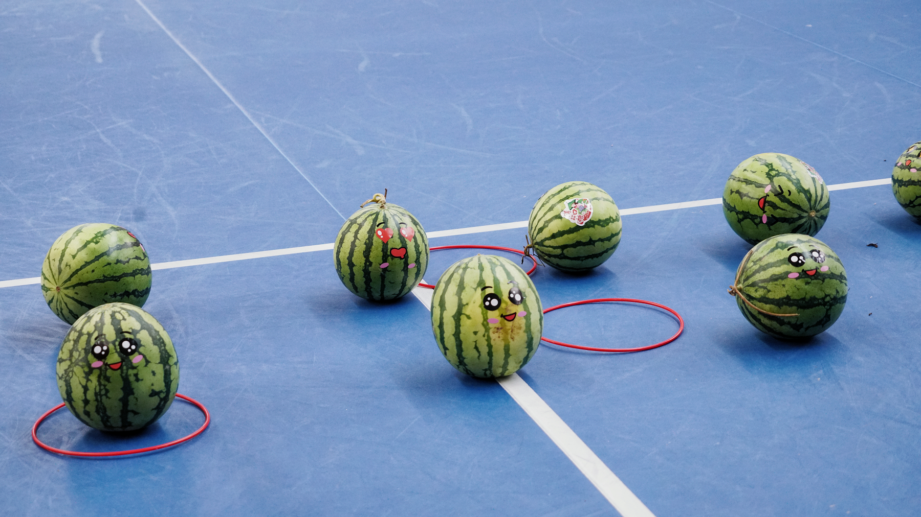 “進擊吧西瓜”環(huán)節(jié)中,大家化身“西瓜勇士”,奮力投擲,隨著手中“西瓜球”破空而出,擊倒地面上瓶子,場上歡呼聲彌漫著收獲勝利的喜悅。