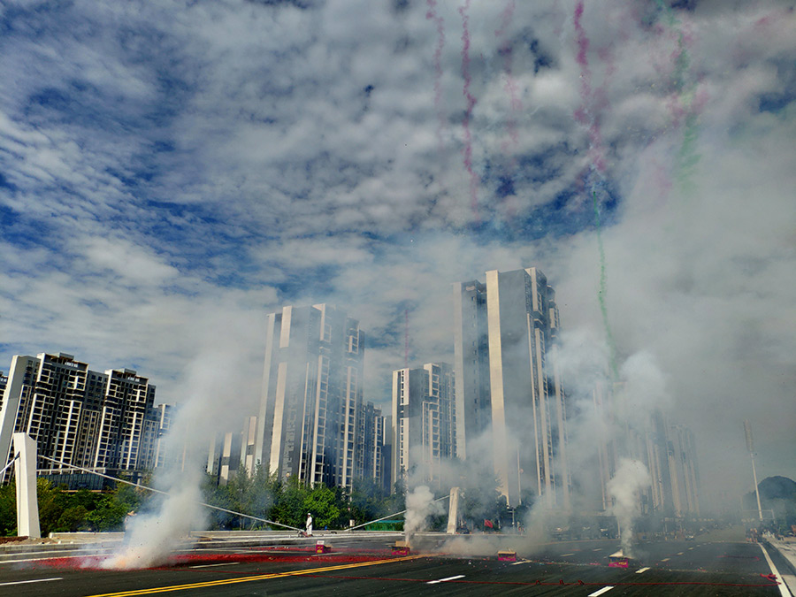 新龍路橋由上海市政交通設(shè)計研究院有限公司設(shè)計,于2016年10月30日開工建設(shè)。橋梁為鋼筋混凝土斜腿鋼構(gòu),橋臺采用鋼筋混凝土結(jié)構(gòu),橋身橫跨核心區(qū)水系沙溏河,長56米,寬47米,橋下的景觀游船河道42米,是連接新、老城區(qū)的重要樞紐橋梁,今天橋梁的快車道全線通車,橋梁輔道及綠化帶預(yù)計8月20日完成。
