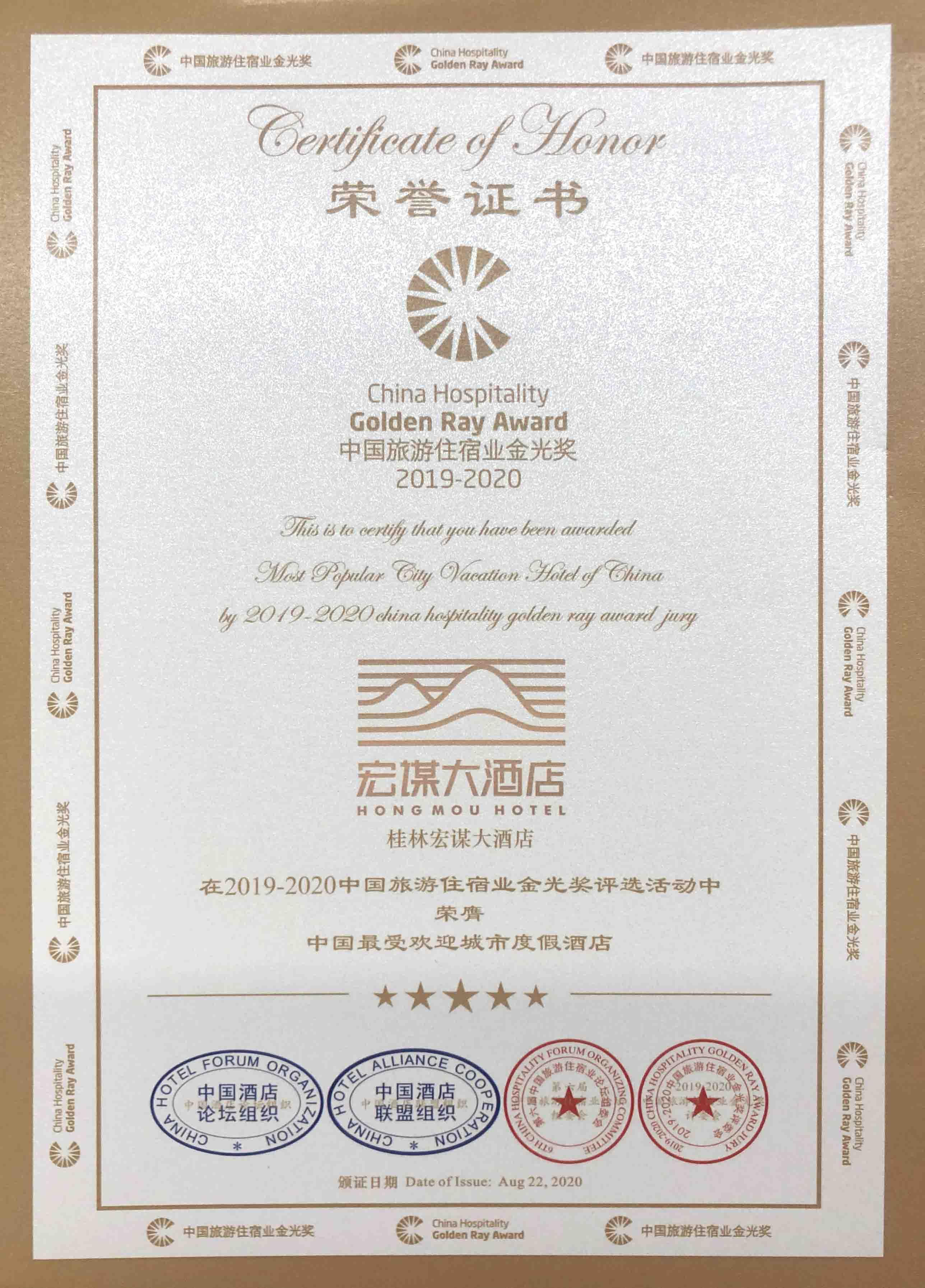 金光獎(jiǎng)是中國(guó)旅游住宿行業(yè)跨業(yè)界、跨年度、覆蓋面最廣的獎(jiǎng)項(xiàng),獲獎(jiǎng)評(píng)選經(jīng)過各學(xué)術(shù)、專業(yè)、跨界領(lǐng)域評(píng)委根據(jù)各酒店競(jìng)爭(zhēng)力、住房率、收益利潤(rùn)等多個(gè)標(biāo)準(zhǔn)評(píng)選而出。桂林宏謀大酒店此次榮獲中國(guó)酒店金光獎(jiǎng)的兩項(xiàng)殊榮,是對(duì)酒店不斷深化文化藝術(shù)主題,追求酒店優(yōu)秀服務(wù)品質(zhì)的認(rèn)可!
