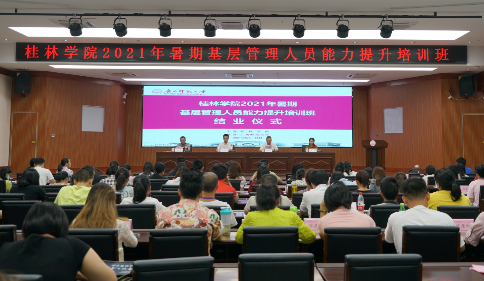 8月2日下午,桂林學院基層管理人員能力提升培訓班結(jié)業(yè)儀式在廣西師范大學育才校區(qū)國際教育交流中心報告廳舉行,共有來自桂林學院的98名基層管理人員參加了這次為期三天的培訓。廣西師范大學黨委常委、組織部部長林國慶,桂林新城投資集團黨總支書記、董事長、總經(jīng)理、桂林學院董事長周道林,桂林學院校長楊樹喆等出席結(jié)業(yè)儀式。廣西師范大學干部教育培訓學院辦公室主任許鋼主持結(jié)業(yè)儀式。
