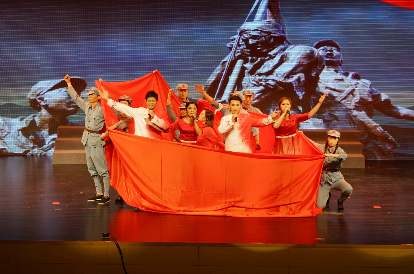 節(jié)目參演的12人分別來(lái)自集團(tuán)公司各部室、子公司的一線崗位。為了就老師空余時(shí)間集合排練,大家犧牲周末、中秋、下班晚上時(shí)間練舞、朗誦,分工不分家,相互配合,一點(diǎn)不含糊,一個(gè)多月的排練,才換來(lái)了這次來(lái)之不易的集體榮譽(yù)。他們用真摯的情感和生動(dòng)的語(yǔ)言,演繹了紅五團(tuán)里一面彈跡斑斑的英雄戰(zhàn)旗的故事。這面戰(zhàn)旗引領(lǐng)大家穿越時(shí)空,重回革命年代,身臨其境地感受革命先烈們的偉大情懷和感天動(dòng)地的英雄事跡,一句句飽含真情的臺(tái)詞,誦出了新城投人對(duì)黨深情而堅(jiān)定、樸素而真摯的告白,贏得了現(xiàn)場(chǎng)觀眾和評(píng)委的陣陣掌聲。