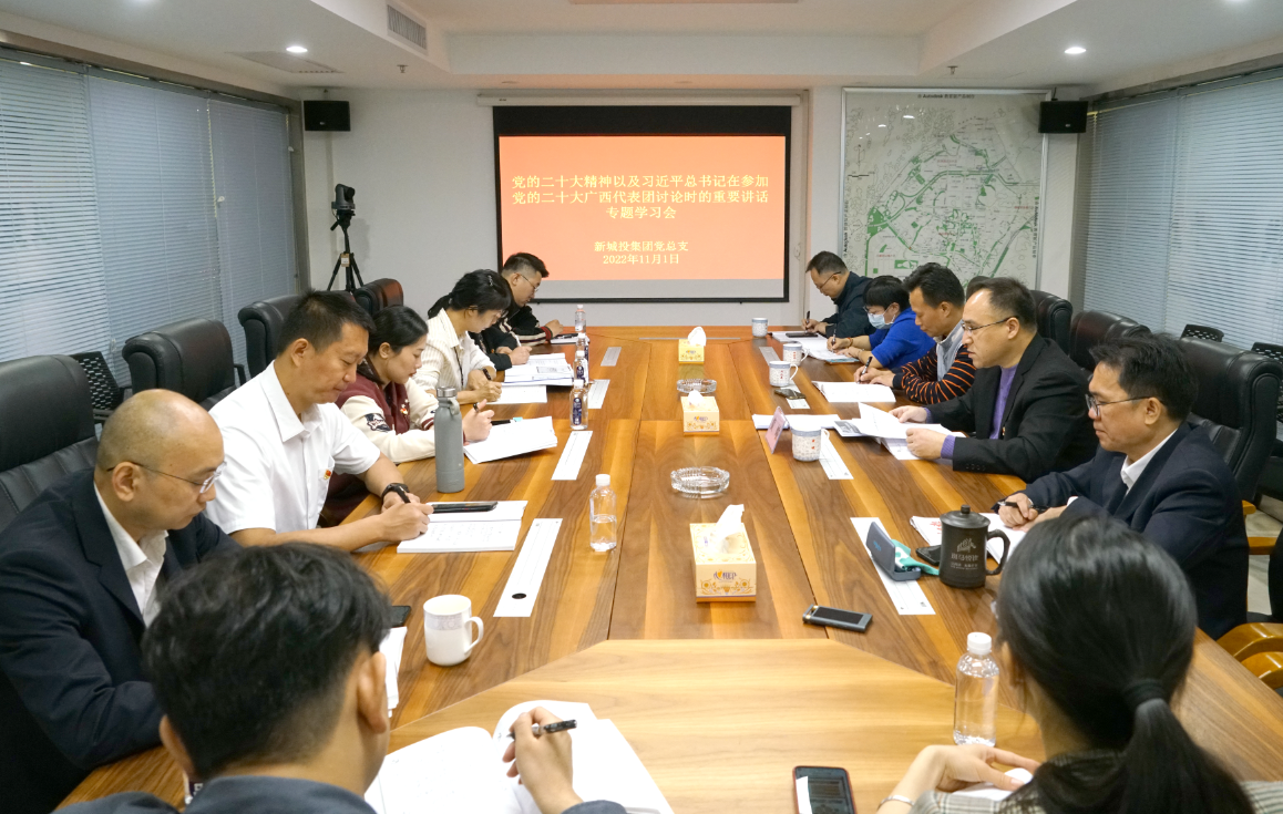 2022年11月1日,集團(tuán)黨總支副書記、總經(jīng)理黃峻主持召開黨總支(擴(kuò)大)會(huì)議,明確提出把抓好學(xué)習(xí)貫徹黨的二十大精神和習(xí)近平總書記在參加黨的二十大廣西代表團(tuán)討論時(shí)的重要講話作為當(dāng)前和今后一個(gè)時(shí)期的首要政治任務(wù),堅(jiān)持?jǐn)[在首要位置,做到首位首抓。