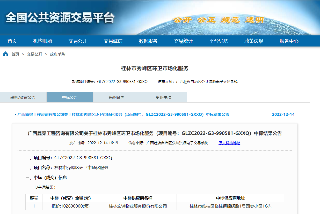 在臨桂新區(qū)黨工委管委的領(lǐng)導(dǎo)下,新城投集團(tuán)緊緊圍繞市委、市政府有關(guān)決策部署,聚焦融資建設(shè)、市政物業(yè)等主業(yè),不斷探索“城市服務(wù)”新模式。2022年年末,集團(tuán)下轄桂林宏謀物業(yè)服務(wù)股份有限公司(以下簡(jiǎn)稱宏謀物業(yè))通過(guò)市場(chǎng)公開(kāi)競(jìng)標(biāo)獲得“秀峰區(qū)環(huán)衛(wèi)市場(chǎng)化服務(wù)項(xiàng)目”。這標(biāo)志著新城投集團(tuán)在國(guó)資國(guó)企改革、物業(yè)服務(wù)領(lǐng)域走向市場(chǎng)化等方面邁出堅(jiān)實(shí)腳步。