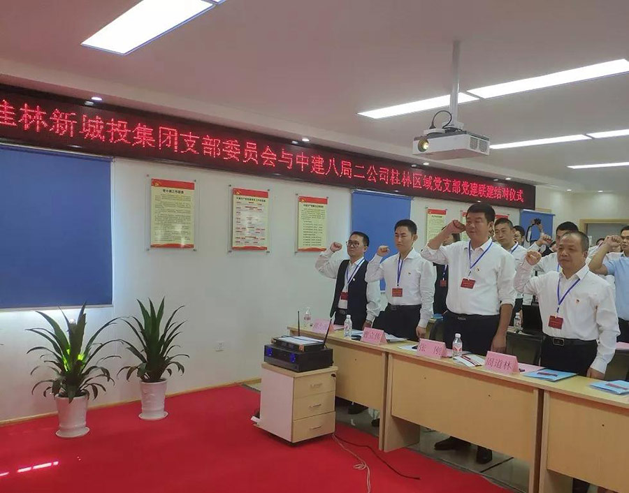 2018年10月30日上午,中共桂林新城投資開發(fā)集團(tuán)有限公司黨支部與中共中建八局第二建設(shè)有限公司廣西公司桂林區(qū)域黨支部在桂林市臨桂新區(qū)基地項(xiàng)目部舉行黨建聯(lián)建結(jié)對(duì)儀式。