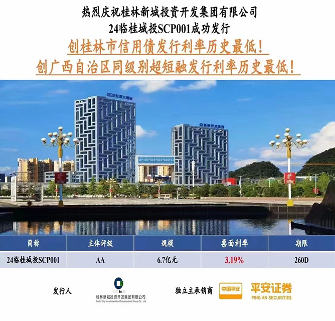 1月9日,桂林城鄉(xiāng)建設(shè)控股集團旗下桂林新城投資開發(fā)集團有限公司成功發(fā)行2024年度第一期超短融,規(guī)模6.7億元,期限260天,票面利率3.19%,認購倍數(shù)5.08倍,本期超短融由平安證券獨立承銷。此次成功發(fā)行超短融創(chuàng)下桂林市有史以來信用債發(fā)行的最低利率,也是有史以來廣西壯族自治區(qū)同級別超短融發(fā)行利率最低!在市委市政府、市金融辦、市國資委、城建集團的指導(dǎo)幫助下,新城投集團認真落實各項決策部署,結(jié)合自身實際,爭分奪秒抓發(fā)展,多措并舉促融資。