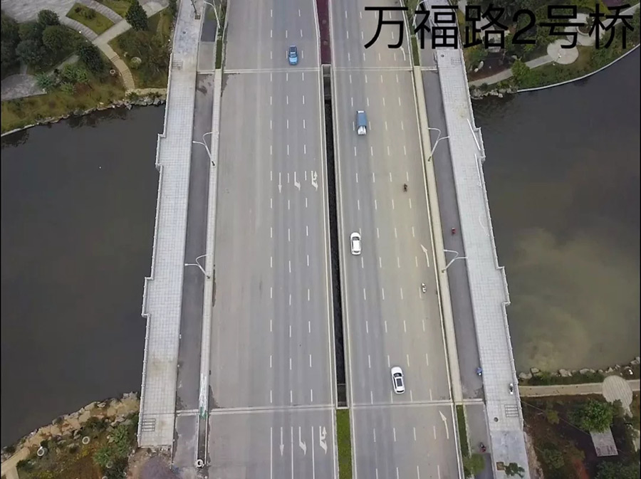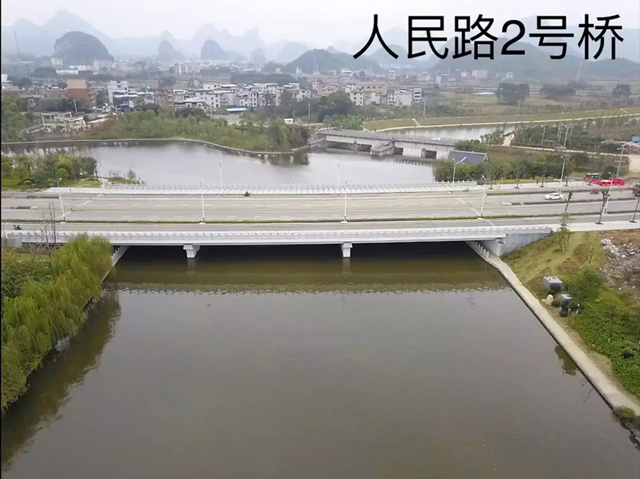 人民路二號橋位于臨桂新區(qū)人民路(萬福路-臨雁路段)上,是臨桂區(qū)通往秧塘工業(yè)園區(qū)的重要通道,橋梁結(jié)構(gòu)采用32米+32米+32米三跨等截面連續(xù)結(jié)構(gòu),跨越臨桂新區(qū)規(guī)劃水系,橋梁中心線與河道正交,橋梁長度為102.2米、寬度為40米,該工程于2017年5月開工建設(shè),于2018年6月21日完成初步驗收。
