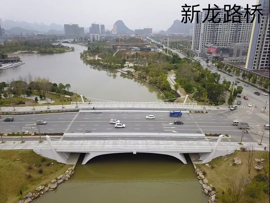 新龍路橋位于臨桂新區(qū)中心區(qū)東部,跨越臨桂新區(qū)沙溏河,橋梁中心線與河道正交,采用單跨斜腿剛構(gòu),斜腿剛構(gòu)跨徑41.282米,主梁總長56米,橋梁總寬47米,分三幅設(shè)置,沉降伸縮縫設(shè)置在機非隔離帶中間,機動車道部分橋?qū)?5米,每側(cè)人行道和非機動車部分橋?qū)?1米,橋梁與河道正交。該工程于2017年1月開工建設(shè),于2018年9月27日完成初步驗收。新龍路橋跨越新區(qū)水系,是連接臨桂新老城區(qū)的重要橋梁,該橋梁使核心區(qū)的交通網(wǎng)絡(luò)趨于完善,標志著臨桂新區(qū)核心區(qū)的橋梁工程基本建設(shè)完成。