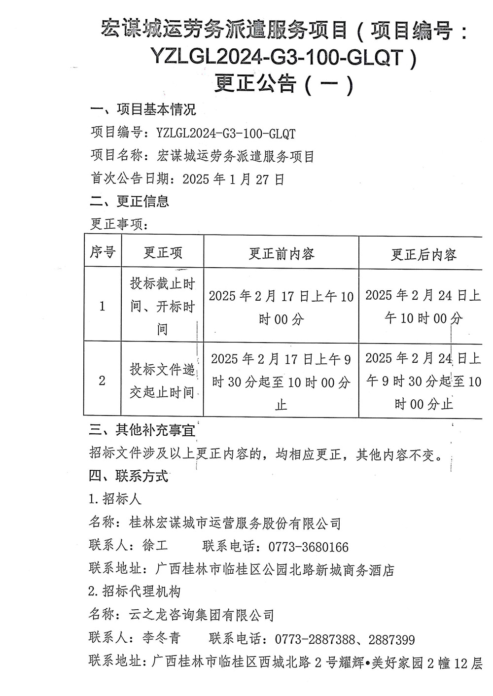 宏謀城運(yùn)勞務(wù)派遣服務(wù)項(xiàng)目(項(xiàng)目編號(hào):YZLGL2024-G3-100-GLQT)更正公告(一)