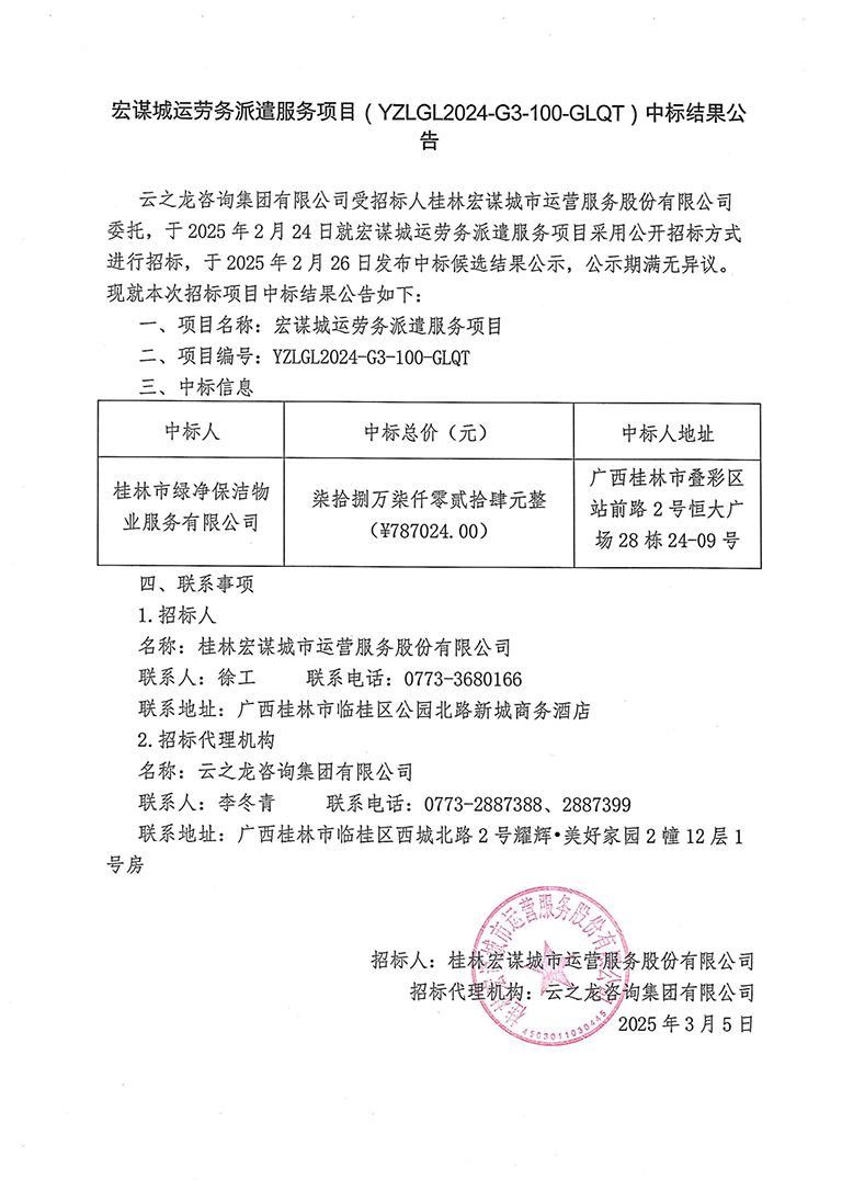 宏謀城運(yùn)勞務(wù)派遣服務(wù)項(xiàng)目(YZLGL2024-G3-100-GLQT)中標(biāo)結(jié)果公告