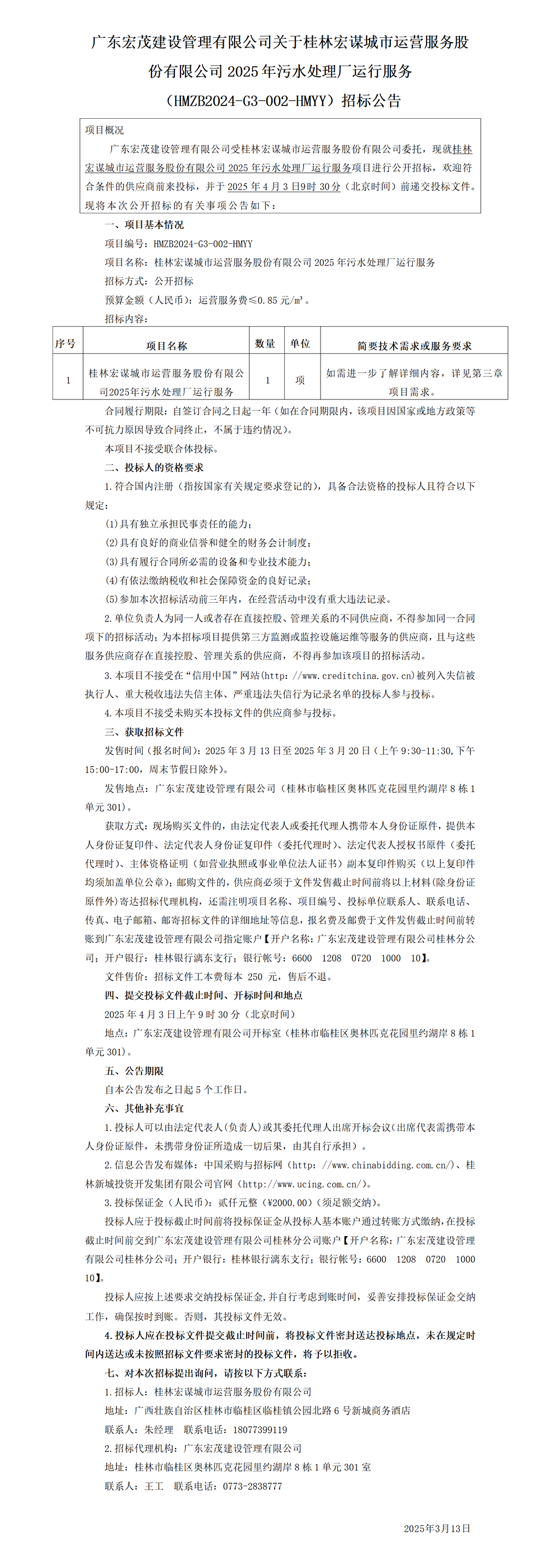 廣東宏茂建設(shè)管理有限公司關(guān)于桂林宏謀城市運營服務(wù)股份有限公司2025年污水處理廠運行服務(wù)(HMZB2024-G3-002-HMYY)招標(biāo)公告