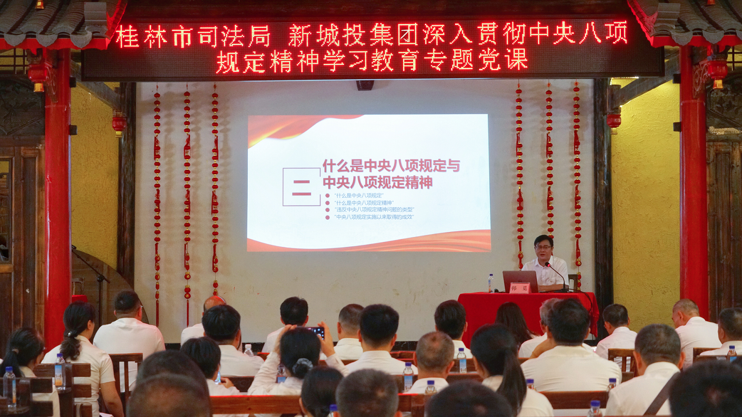 隨后,韓覓同志為全體人員講授了一堂專題黨課。以“深學(xué)篤行習(xí)近平總書記關(guān)于加強(qiáng)黨的作風(fēng)建設(shè)的重要論述 持續(xù)擦亮中央八項(xiàng)規(guī)定‘金色名片’以作風(fēng)建設(shè)新成效推動(dòng)司法行政工作和國(guó)有企業(yè)內(nèi)控高質(zhì)量發(fā)展”為題,圍繞“為什么要強(qiáng)調(diào)作風(fēng)建設(shè),什么是中央八項(xiàng)規(guī)定與中央八項(xiàng)規(guī)定精神,如何開展好深入貫徹中央八項(xiàng)規(guī)定精神學(xué)習(xí)教育”三個(gè)方面,重點(diǎn)闡述了“為什么、是什么、怎么做”,進(jìn)一步增強(qiáng)了黨員干部紀(jì)律意識(shí)和規(guī)矩意識(shí),對(duì)切實(shí)改進(jìn)工作作風(fēng)具有很強(qiáng)的指導(dǎo)意義。