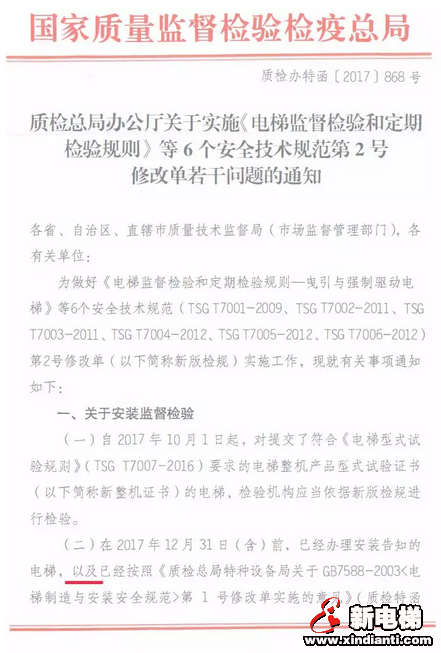 檢規(guī)2號修改單于2017年10月1日起施行,配合此技術(shù)規(guī)范執(zhí)行的總局函件為“質(zhì)檢總局辦公廳關(guān)于實施《電梯監(jiān)督檢驗和定期檢驗規(guī)則》等6個安全技術(shù)規(guī)范等2號修改單若干問題的通知(質(zhì)檢辦特函【2017】868號)”。其中關(guān)于安裝監(jiān)督檢驗的內(nèi)容見下圖: