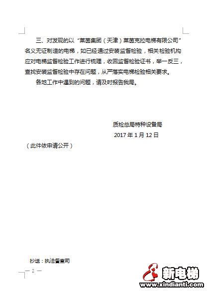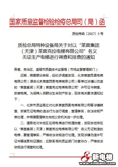 2017年剛開(kāi)年,國(guó)家質(zhì)量監(jiān)督檢驗(yàn)檢疫總局即發(fā)出重要文件,要求各地全面排查北京萊茵西奧電梯有限公司(原名北京萊茵西恩電梯有限公司)等單位涉嫌以偽造的“萊茵集團(tuán)(天津)萊茵克拉電梯有限公司”許可證銷售、安裝電梯。