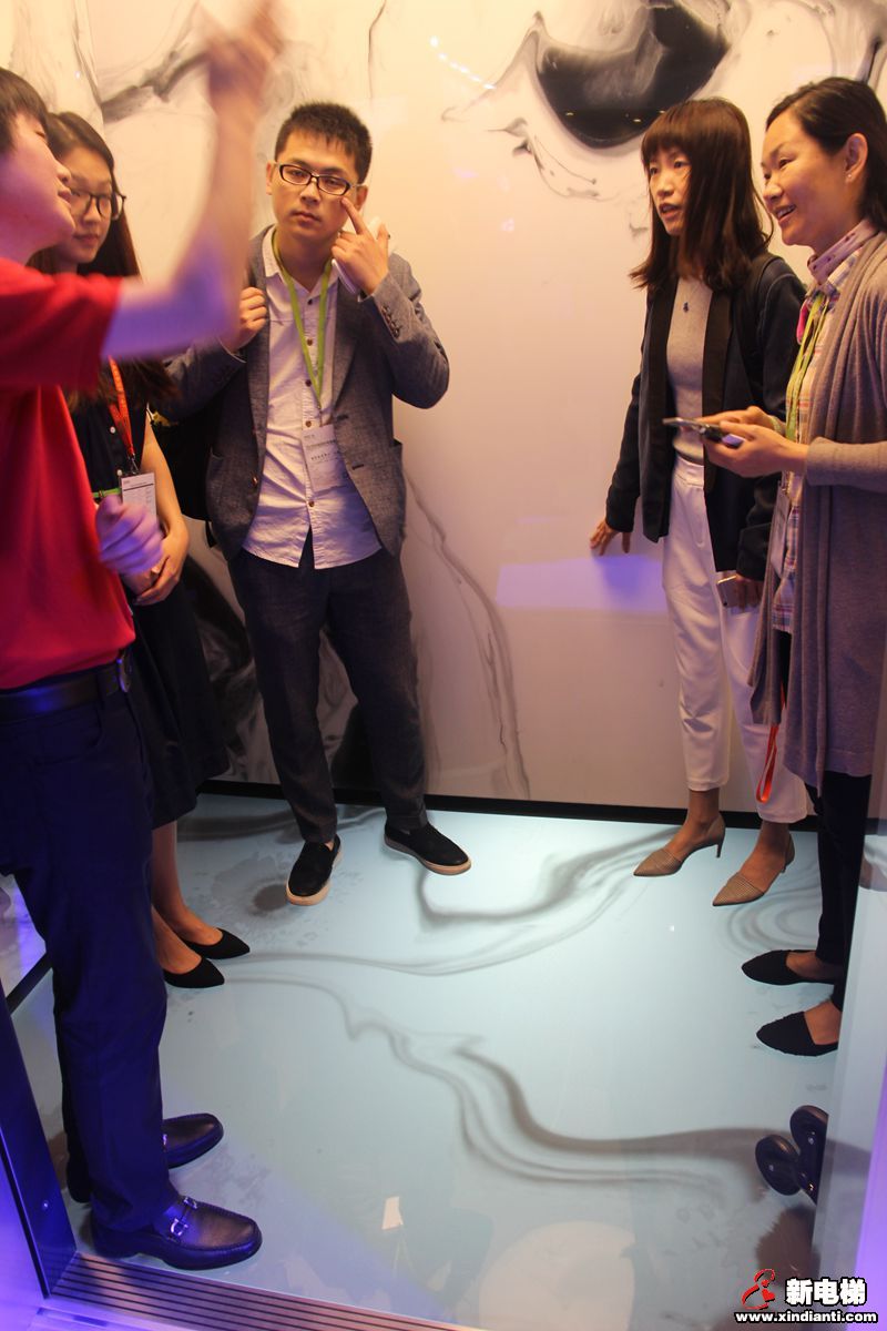 東芝幻影互動(dòng)轎廂技術(shù),整體轎廂構(gòu)成一幅山水畫(huà),乘客踩踏地面腳印即可融入中國(guó)畫(huà)的創(chuàng)作,帶給乘客奇幻的乘梯體驗(yàn)
