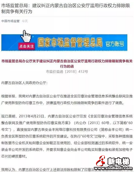 據(jù)《新京報》報道,6月22日,國家市場監(jiān)管總局致函內(nèi)蒙古自治區(qū)政府,內(nèi)蒙古自治區(qū)公安廳在未履行任何招投標(biāo)程序的情況下,要求各盟市公安局卸載經(jīng)公安部檢測通過的印章治安管理信息系統(tǒng)軟件,統(tǒng)一安裝使用當(dāng)?shù)啬彻镜南到y(tǒng)軟件,屬于濫用行政權(quán)力排除限制競爭,且至今未整改,建議其責(zé)令公安廳改正。