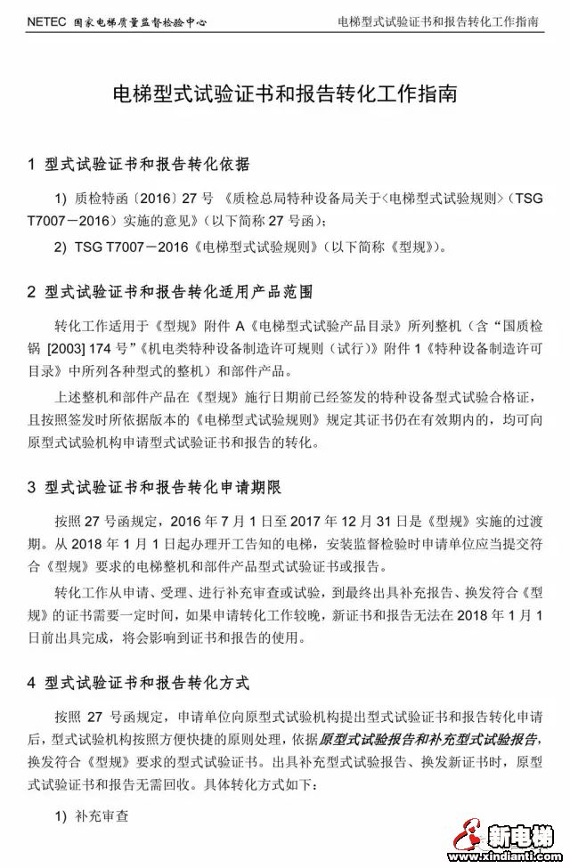 根據(jù)國(guó)家質(zhì)檢特函2016年第27號(hào),簡(jiǎn)稱27號(hào)函,以及電梯型式試驗(yàn)規(guī)則,2016年7月1日至2017年12月31日為過渡期,2018年1月1日,應(yīng)全部完成新證書的轉(zhuǎn)化工作,具體如下: