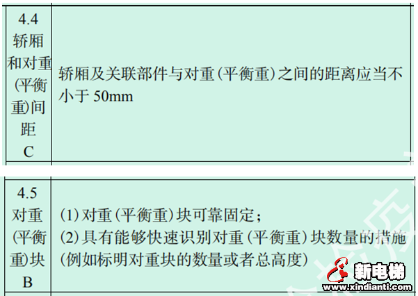 其中的4.4項(xiàng)主要目的是防止作業(yè)人員在轎頂時(shí),防止被對(duì)重砸傷,4.5項(xiàng)主要目的一是確保對(duì)重塊固定牢靠,二是快速識(shí)別對(duì)重塊的數(shù)量、防止對(duì)重塊丟失造成平衡系數(shù)的不適用。
