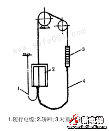 對(duì)重系統(tǒng)由對(duì)重和重量補(bǔ)償裝置構(gòu)成。一方面對(duì)重可以平衡轎廂和部分載重量,一方面由此產(chǎn)生曳引力。重量補(bǔ)償裝置用來(lái)平衡轎廂與對(duì)重的重量差,保持電梯運(yùn)行時(shí)負(fù)載力矩的穩(wěn)定。如下圖所示,3對(duì)重位于4轎廂的另一邊,通過(guò)曳引鋼絲繩連接。它在電梯曳引系統(tǒng)起到節(jié)能作用,它在配重前理論計(jì)算使電梯載重最優(yōu)化。