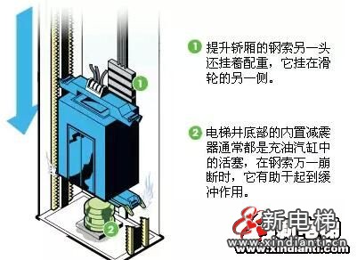在井道上下端站附近的緩沖器會(huì)吸收下落電梯的動(dòng)能。