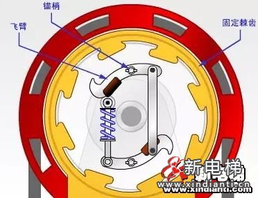 下圖就是一個(gè)限速器的典型結(jié)構(gòu),當(dāng)轉(zhuǎn)動(dòng)速度過(guò)快時(shí),離心力會(huì)使飛臂向外運(yùn)動(dòng),拉住缸體周?chē)募X,讓滑輪停止運(yùn)動(dòng)。這時(shí),調(diào)節(jié)繩的自我鎖定狀態(tài)會(huì)激活控制桿連接裝置,觸發(fā)安全鉗,令轎廂停止。