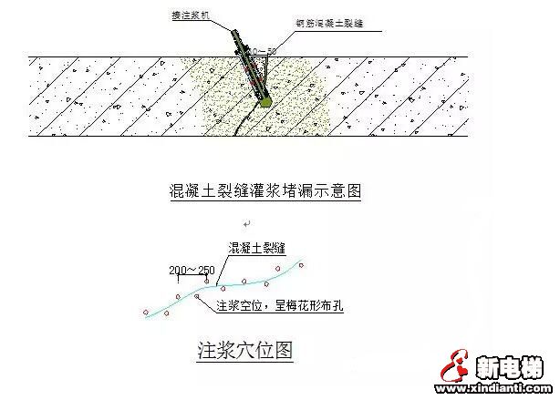 (2)布孔:施工操作人員從電梯井基坑的一測(cè)開始逐處查找漏點(diǎn),并用紅色噴霧式油漆標(biāo)明。標(biāo)示的方法根據(jù)滲漏部位的不同確定,大面積的滲漏采用密集的紅點(diǎn)標(biāo)示,裂縫滲漏采用紅×標(biāo)示,一般是沿著裂縫的走向每隔250px兩邊交替標(biāo)記,單個(gè)的滲水點(diǎn)采用紅色的○標(biāo)示;