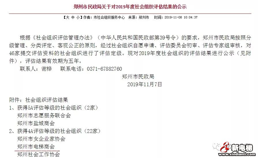【中國(guó)•鄭州  2019年11月8日】根據(jù)《社會(huì)組織評(píng)估管理辦法》(中華人民共和國(guó)民政部第39號(hào)令)的要求,鄭州市民政局按照分級(jí)管理、分類評(píng)定、客觀公正的原則,經(jīng)過(guò)社會(huì)組織自愿申請(qǐng)、評(píng)估委員會(huì)初審、評(píng)估專家組審核,對(duì)46家提交評(píng)估資料的社會(huì)組織進(jìn)行了評(píng)估定級(jí)。近日,鄭州市民政局公示2019年度社會(huì)組織評(píng)估結(jié)果,鄭州市電梯商會(huì)獲評(píng)為4A社會(huì)組織稱號(hào)。