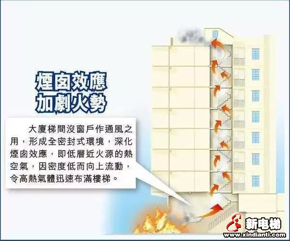當(dāng)建筑物內(nèi)發(fā)生火災(zāi)時(shí),煙囪效應(yīng)會(huì)將濃煙或火苗抽入井道內(nèi),造成火災(zāi)危情的擴(kuò)散。