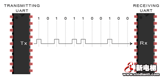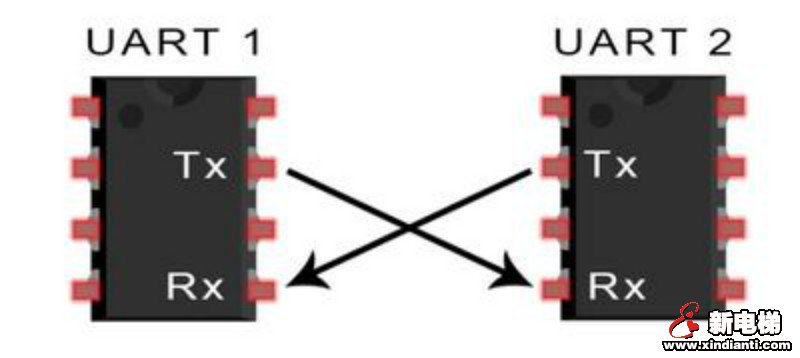 在UART通信中,兩個(gè)UART直接相互通信。發(fā)送UART將來(lái)自CPU等控制設(shè)備的并行數(shù)據(jù)轉(zhuǎn)換為串行形式,并將其串行發(fā)送到接收UART,接收UART然后將串行數(shù)據(jù)轉(zhuǎn)換回接收設(shè)備的并行數(shù)據(jù)。在兩個(gè)UART之間傳輸數(shù)據(jù)只需要兩根線。數(shù)據(jù)從發(fā)送UART的Tx引腳流向接收UART的Rx引腳: