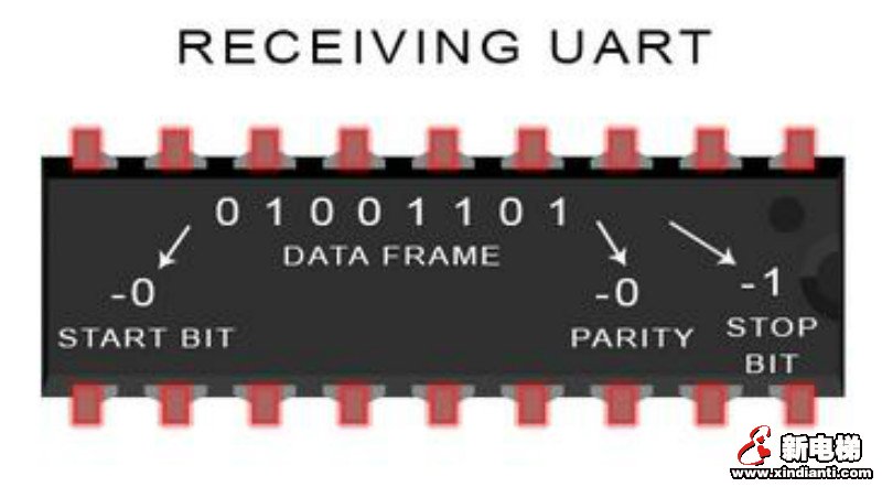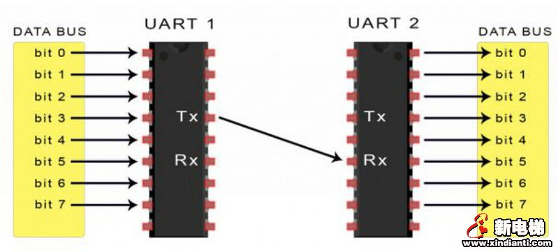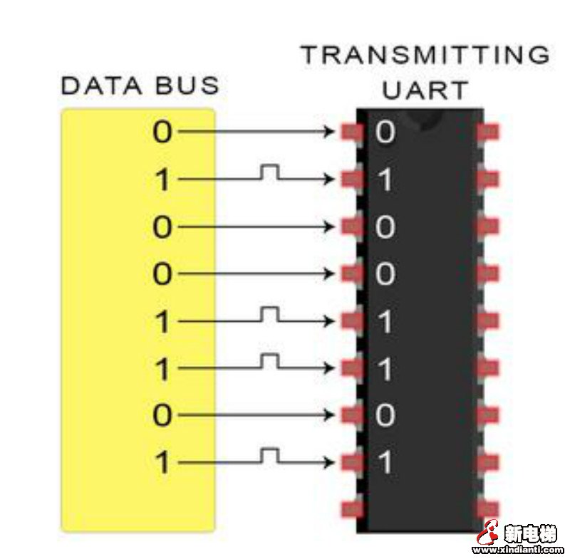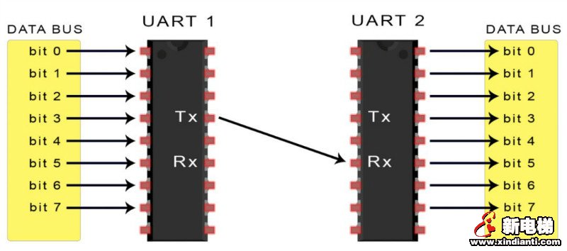 UART傳輸數(shù)據(jù)依靠的是UART總線,數(shù)據(jù)總線用于通過(guò)CPU,存儲(chǔ)器或微控制器等其他設(shè)備將數(shù)據(jù)發(fā)送到UART。數(shù)據(jù)以并行形式從數(shù)據(jù)總線傳輸?shù)桨l(fā)送UART。在發(fā)送UART從數(shù)據(jù)總線獲得并行數(shù)據(jù)之后,它將添加起始位,奇偶校驗(yàn)位和停止位,從而創(chuàng)建數(shù)據(jù)包。接下來(lái),數(shù)據(jù)包在Tx引腳上逐位串行輸出。UART接收端則在其Rx引腳上逐位讀取數(shù)據(jù)包。然后,接收UART將數(shù)據(jù)轉(zhuǎn)換回并行形式,并刪除起始位,奇偶校驗(yàn)位和停止位。最后,接收UART將數(shù)據(jù)包并行傳輸?shù)浇邮斩说臄?shù)據(jù)總線: