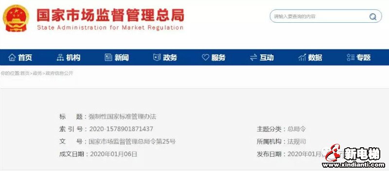 《強制性國家標準管理辦法》已于2019年12月13日經(jīng)國家市場監(jiān)督管理總局2019年第16次局務會議審議通過,現(xiàn)予公布,自2020年6月1日起施行。
