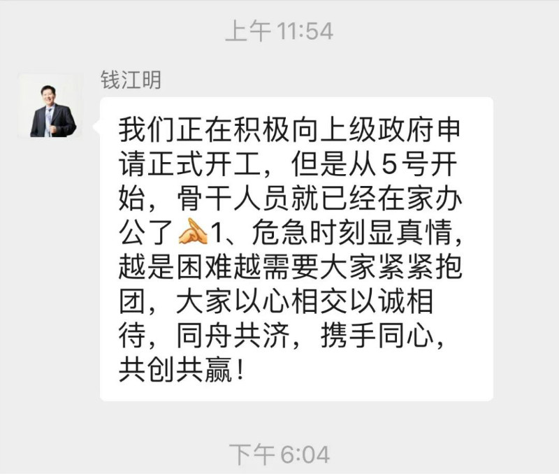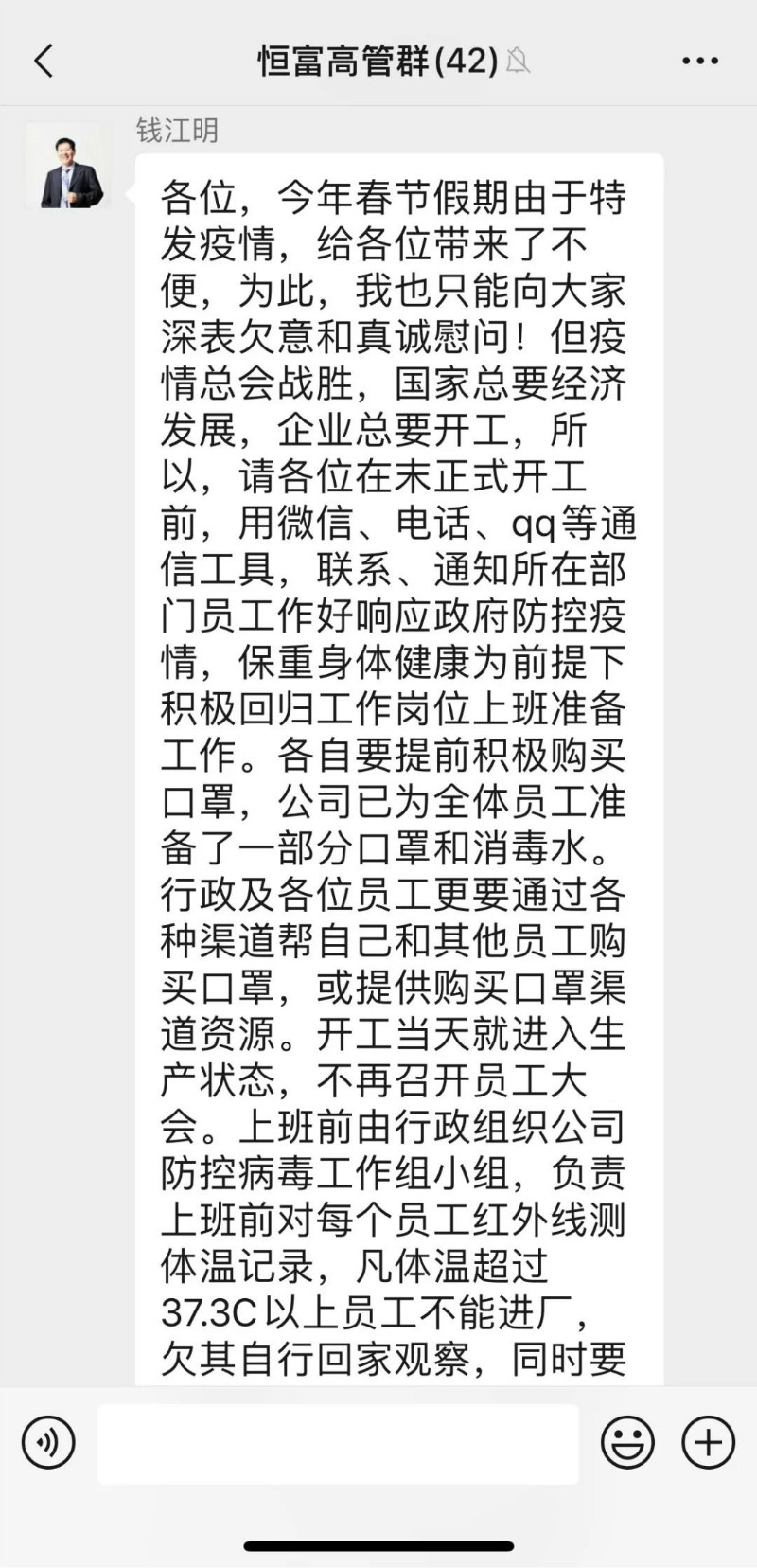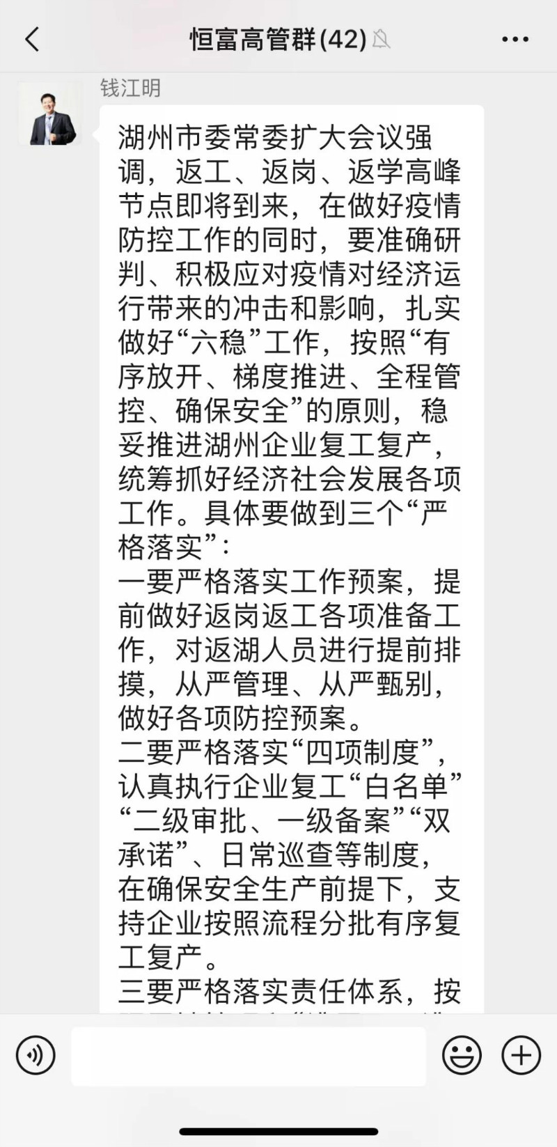 Huzhou government has put off the time for enterprises to resume work in response to the serious outbreak of Corona Virus Pneumonia Disease. Hengfu Group has complied with government regulations to updating the personnel registration, and established an online communicating platform, named Preparation Group for Resuming Work in Hengfu Group, on February 3rd, to relay instructions from government and share in-time information in the group.