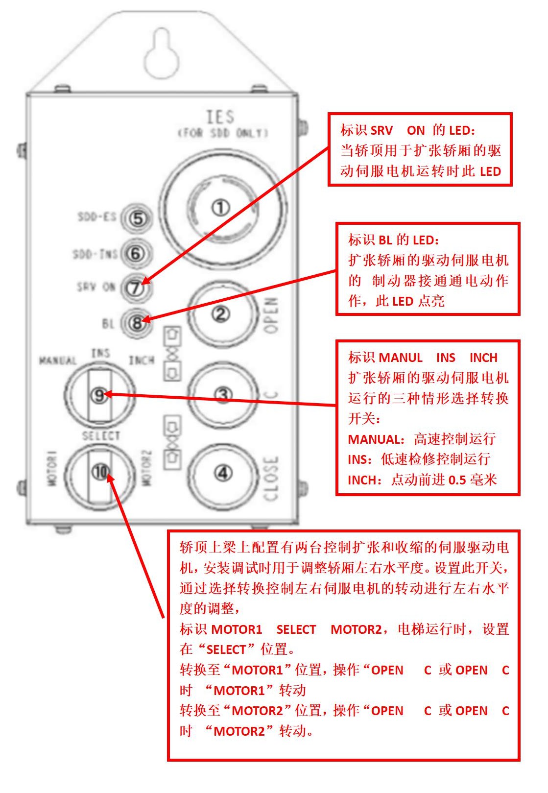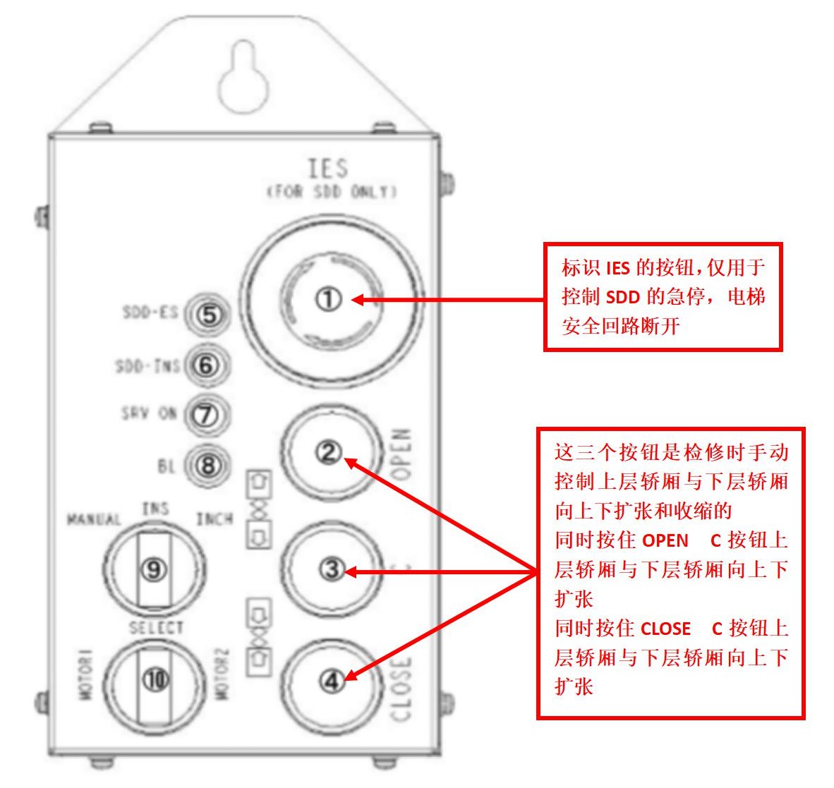 奧的斯超級雙層轎廂電梯是為超級摩天大樓專門設(shè)計的,一臺電梯具有上下雙層轎廂的高速電梯,其部件設(shè)計的獨特,下面先理解一下手動控制上下轎廂移動的遠程控制盒。