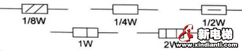 電阻器的額定功率是指 在標(biāo)準(zhǔn)大氣壓和一定的環(huán)境溫度下,電阻器能夠長期負(fù)荷而不改變其性能所允許的功率。功率用P表示,單位為瓦特(W),功率與電流和電壓的關(guān)系為 P=UI 根據(jù)部標(biāo),不同類型的電阻器有不同系列的額定功率,一般可在0.05-500W之間分?jǐn)?shù)十種規(guī)格,最常用的在1/8~2W之間。在電路中的表示符號如下圖所示。