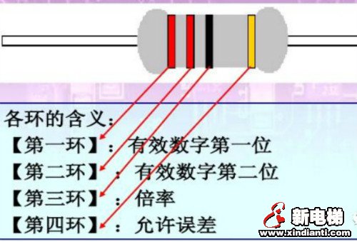 小功率的電阻器多數(shù)情況下用色環(huán)表示,特別是0.5W以下的碳膜和金屬膜電阻器較為普通。電阻器的色環(huán)可分為三環(huán)、四環(huán)、五環(huán)3種,常見的色環(huán)標(biāo)注電阻器為四、五環(huán)。含義見下圖:
