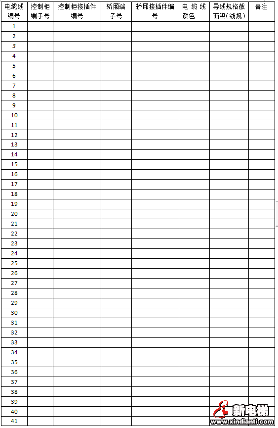 電纜線編號控制柜端子號控制柜接插件編號轎廂端子號轎廂接插件編號電纜線顏色導(dǎo)線規(guī)格截面積(線規(guī))備注