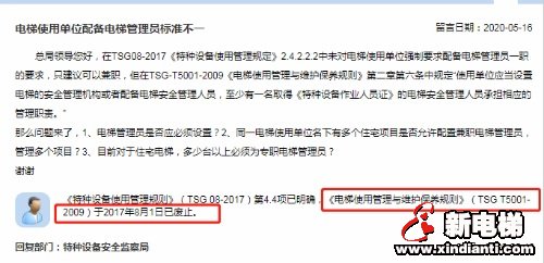 總局回復(fù):《特種設(shè)備使用管理規(guī)則》(TSG 08-2017)第4.4項(xiàng)已明確,《電梯使用管理與維護(hù)保養(yǎng)規(guī)則》(TSG T5001-2009)于2017年8月1日已廢止。