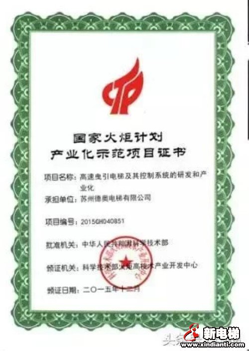 蘇州德奧電梯喜獲國(guó)家火炬計(jì)劃項(xiàng)目證書